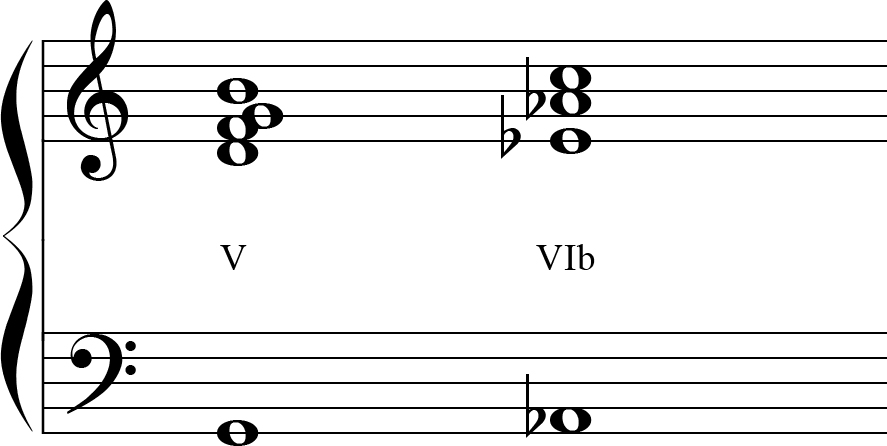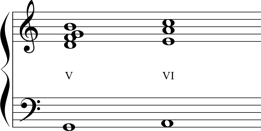 - Fórmula: V–VI (ou outro acorde inesperado).